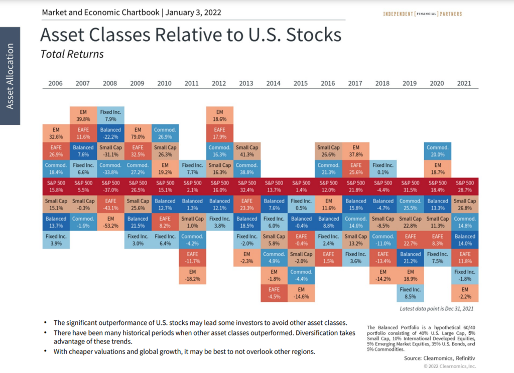 As you can see, there are years that the S&P 500 has been towards to top (2021), other times it’s underperformed other asset classes.