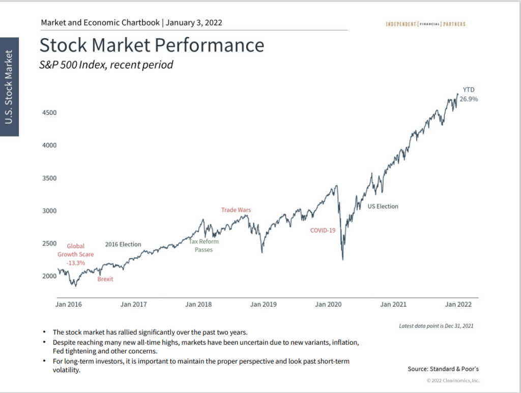 I think most of us looking back on the year would say it was challenging at best. Supply chain issues caused empty shelves throughout stores, the U.S. exit from Afghanistan was a disaster, Iran increased its nuclear capabilities, a riot on the Capitol, a new presidential administration, vaccine rollouts, vaccine mandates, questions about vaccine effectiveness, lockdowns, COVID-19 cases reached over 55 million in the U.S. (me being one of them) with over 800,000 deaths (worldwide those totals are even more staggering with 293 million cases and nearly 5.5 million deaths), political tensions running red-hot, and inflation hitting the highest level in my lifetime … just to name a few.
