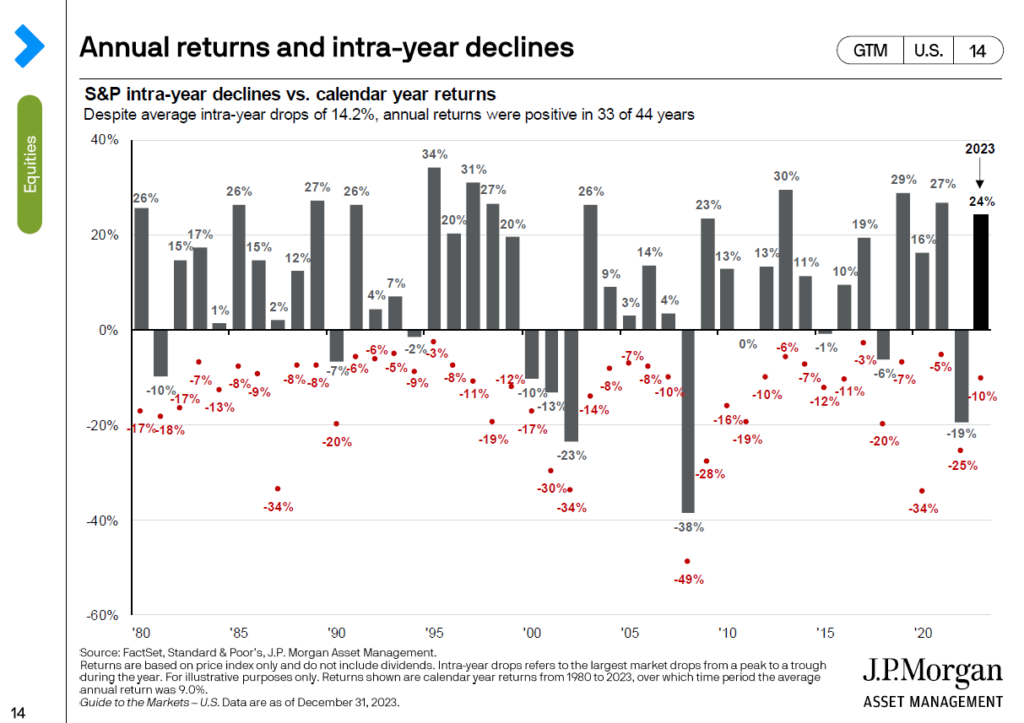 So, 33 of the last 44 years have been positive, but in every year there have been downturns. The average annual drop is 14.2%! In 2023 we saw a 10% downturn in a year that was up 24%. 2022 ended down 19% but was down as much as 25% during the year. Look at how insane 2020 was (ended up 16%, but was down as low as 34% during the year).