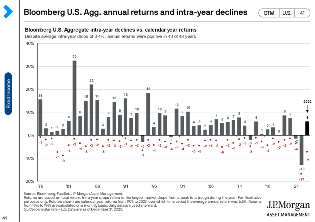 Here you see that 43 of 48 years are positive, but the average intra-year decline of 3.4% still exits. 2023 saw a gain of 6%, but was down as low as 7% during the year. 2022 was a horrible year for bonds with a 13% loss, but it was as bad as 17% during the year. Less volatile than stocks, but there is still a decent amount of fluctuation happening.