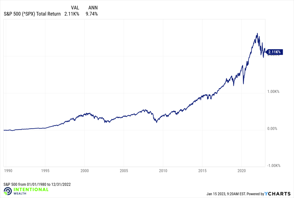 Earlier this month I turned 43 years old (not sure while the official line is for middle age, but I digress 😉). Since my birth month of January 1980 the S&P 500 is up more than 2,110%. From 1/1/1980 to 12/31/2022 the S&P averaged a 9.74% average return (see attached chart).