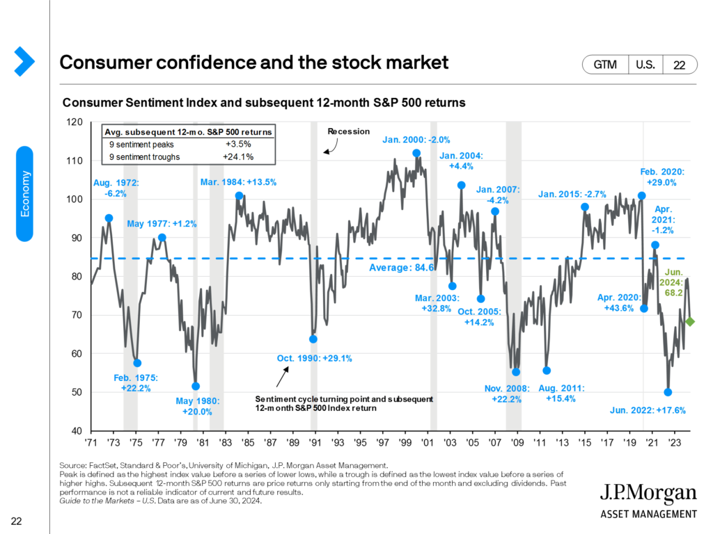 This is a super busy chart but what it shows in the gray squiggly line is the consumer sentiment measurements from 1971 – 2023. There are 18 blue dots, 9 towards the top & 9 towards the bottom, these represent peaks and valleys in consumer sentiment readings. The dotted blue line in the middle is the consumer sentiment average score of 85. Are we having fun yet? 😉